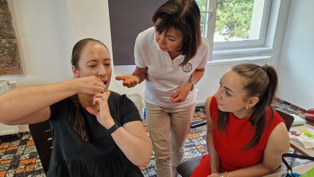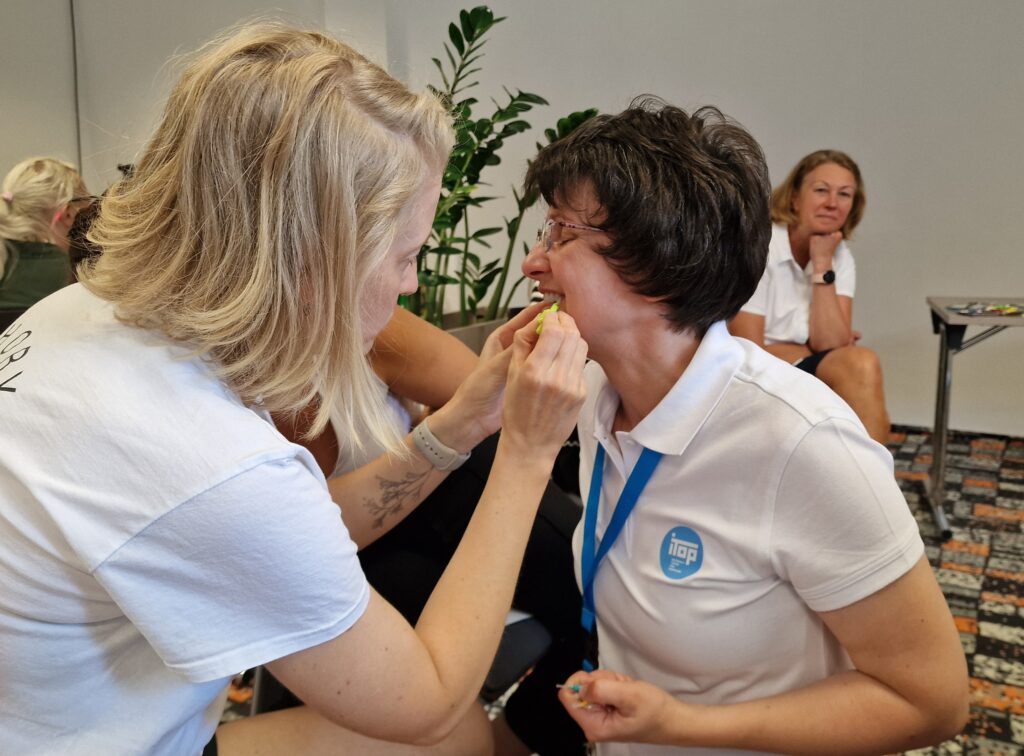 Odpoledne probíhali vlastní 90min praktické nácviky se zkušenými instruktory SPS, T2T 1 instruktor: 1-2 účastníkům. V pátek si účastníci zkusili sami instruovat své kolegy tak, aby byli plně vyzbrojeni do praxe s pacienty. Během dopoledních hodin v průběhu týdne se instruktoři věnovali dětičkám, které přijely s rodiči a učili je a jejich rodiče, jak se smysluplně starat o jejich zoubky.